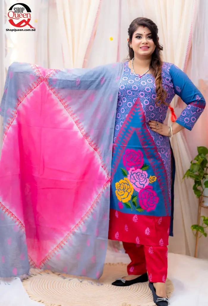 জ্যাকোয়ার্ড কটন কাঠব্লক ও হাতের কাজের স্টিচড থ্রিপিস