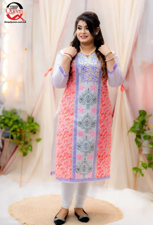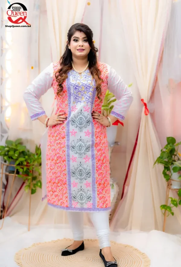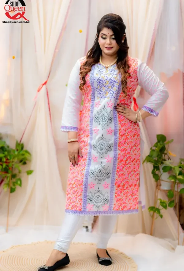 ডিজাইন: কুর্তির ডিজাইন সাধারণত আধুনিক ও ট্রেন্ডি হয়, যার মধ্যে থাকে বিভিন্ন রঙের কম্বিনেশন, লেস বা এমব্রয়ডারি ডিজাইন।
