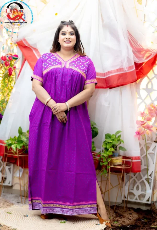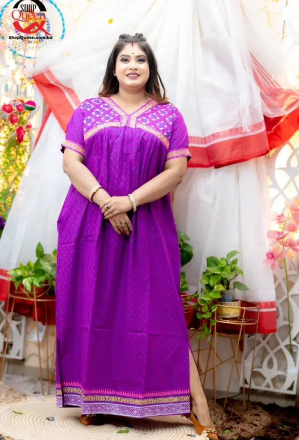 পিওর কটন কাপড় কাঠ ব্লক করা ডিজাইনার মেক্সি,সাথে পকেট আছে, সাথে সামনে হিডেন চেন আছে ব্রেস্ট ফিডিং আপশন আছে