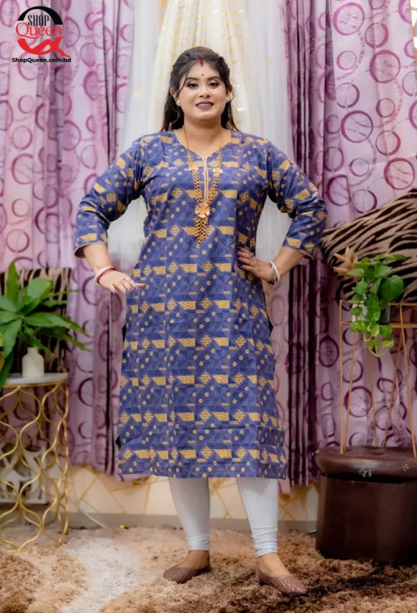 আড়ং কটন ফ্যাব্রিকে তৈরি এই স্টিচড কুর্তি আরামদায়ক ও স্টাইলিশ। প্রতিদিনের ব্যবহার কিংবা বিশেষ অনুষ্ঠানে পরার জন্য একেবারে উপযুক্ত।
